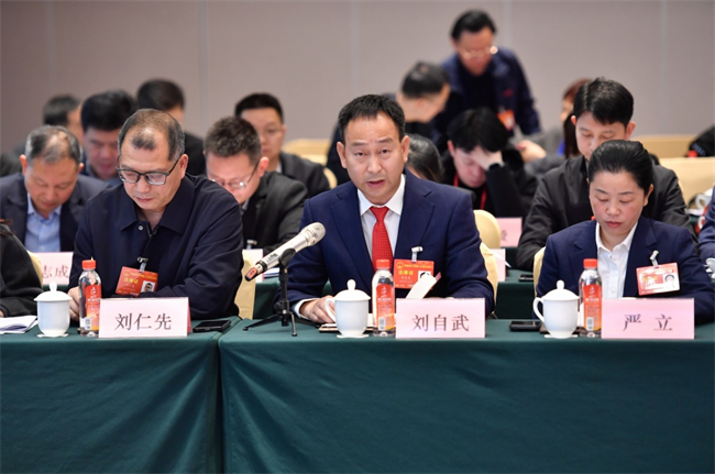 On February 4, Liu Ziwu, a deputy from the Yiyang delegation, offers his suggestion on enhancing the emergency response capacity in the Dongting Lake Area.