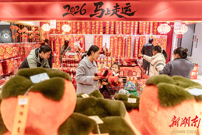 The photo, taken on February 8, shows people selecting Horse-themed decorations at a supermarket in Jishou City. Local trade markets experienced a shopping boom ahead of the Spring Festival, with a dazzling array of special purchases for the Chinese New Year and decorations themed around the Year of the Horse to meet residents' holiday demand. (Photo/Peng Jing)