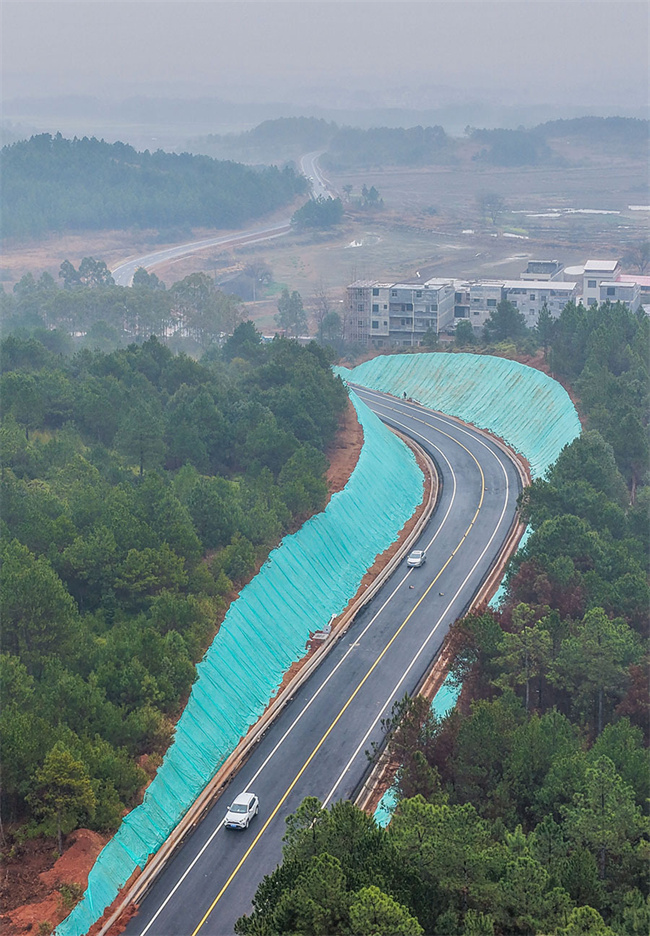 The photo, taken on February 9, shows vehicles traveling along the Gongba section of Shangtan Highway in Daoxian County. Recently, the 58-kilometer Shangtan Highway was fully completed and opened to traffic, serving as a vital transportation link connecting five townships and serving 200,000 residents, effectively promoting integrated urban-rural development. (Photo/Jiang Keqing)