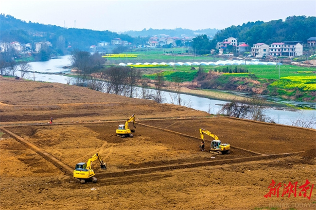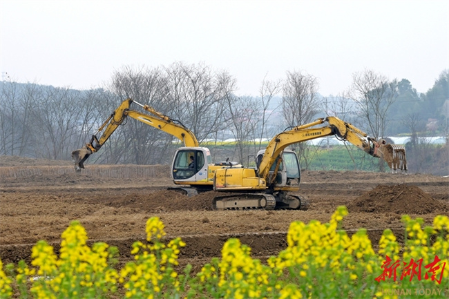 The photo, taken on February 23, shows evacuators working in the field at a high-standard farmland construction project site in Qingshipu Village, Zimenqiao Town, Shuangfeng County. On the same day, multiple high-standard farmland construction projects resumed construction across the county. Construction workers raced against the farming season to accelerate progress, creating a bustling scene in the fields. (Photo/Li Jianxin and Wang Lejun)