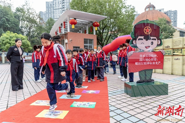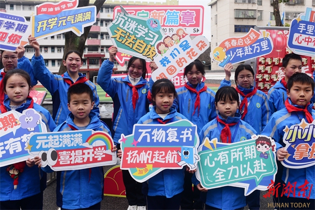 On March 4, students walk into the 8th Primary School of Jishou City through a special "Lei Feng Mark Zone", vowing to carry forward the Lei Feng Spirit. A new semester kicked off for primary and secondary schools as well as kindergartens across Hunan Province on that day. Students returned to their schools in order, embracing the new semester. (Photo/Peng Jing and Ma Liu)