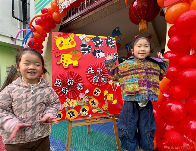 On March 4, children cheer for the new semester activities at a kindergarten in Tongdao Dong Autonomous County. A new semester kicked off for primary and secondary schools as well as kindergartens across Hunan Province on that day. Students returned to their schools in order, embracing the new semester. (Photo/Chen Junyu)