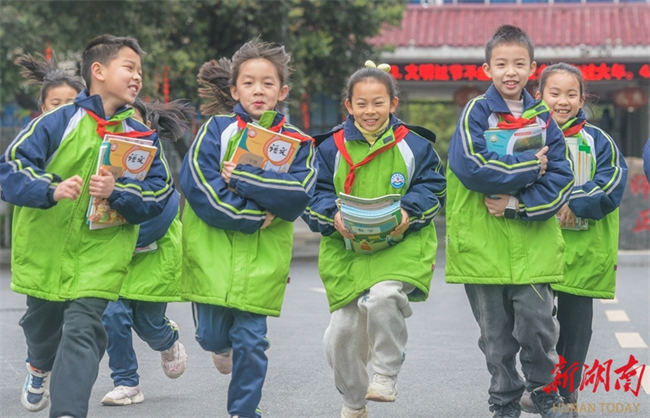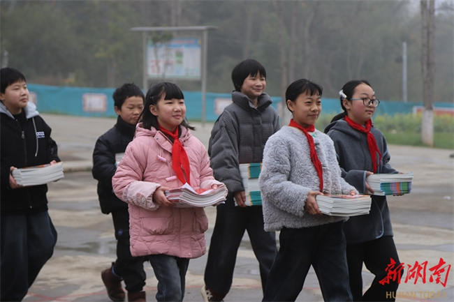 On March 4, students receive their new textbooks happily at the Guipanyuan School in Qiaotouhe Town, Lianyuan City. A new semester kicked off for primary and secondary schools as well as kindergartens across Hunan Province on that day. Students returned to their schools in order, embracing the new semester. (Photo/Zhang Yang)