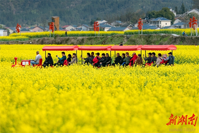 The photo, taken on March 5, shows tourists riding a sightseeing train through a sea of canola flowers at a scenic spot in Baozhi Town, Huitong County. That day marked the begining of "Jingzhe" or "Awakening of Insects," the third of the 24 solar terms on the Chinese lunar calendar. During this period, canola flowers, tulips, violets, and other spring blooms burst into vibrant colors, drawing crowds of visitors to admire the blossoms, take photos, and immerse in the vibrant spring atmosphere. (Photo/Zhang Lei)