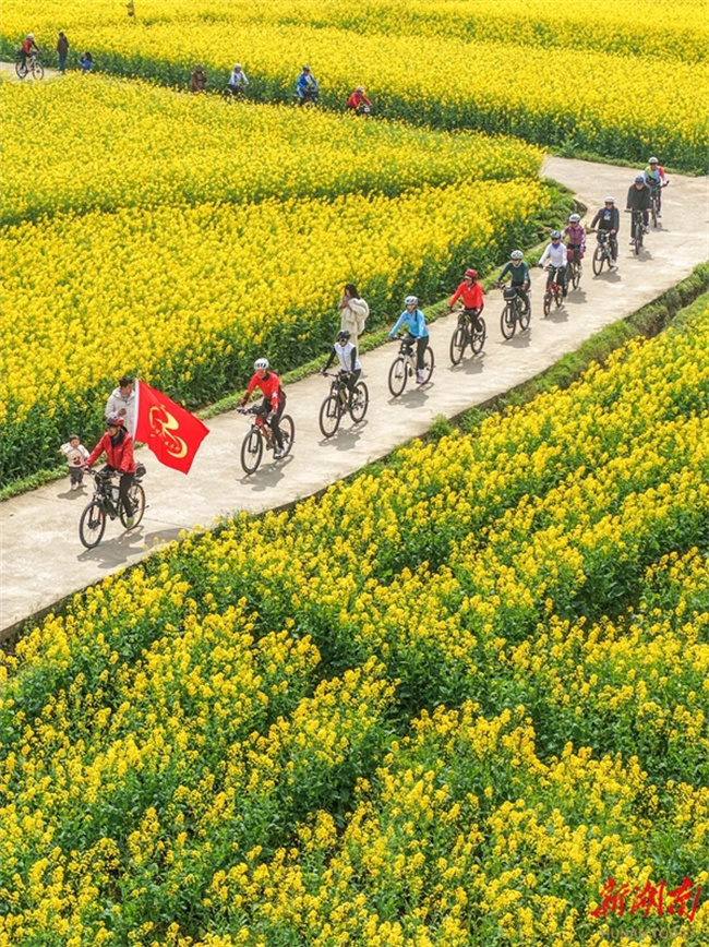 The photo, taken on March 5, shows cycling enthusiasts riding through canola flower fields in Lianghekou Village, Xianglinpu Town, Daoxian County. That day marked the begining of "Jingzhe" or "Awakening of Insects," the third of the 24 solar terms on the Chinese lunar calendar. During this period, canola flowers, tulips, violets, and other spring blooms burst into vibrant colors, drawing crowds of visitors to admire the blossoms, take photos, and immerse in the vibrant spring atmosphere. (Photo/Jiang Keqing)