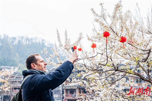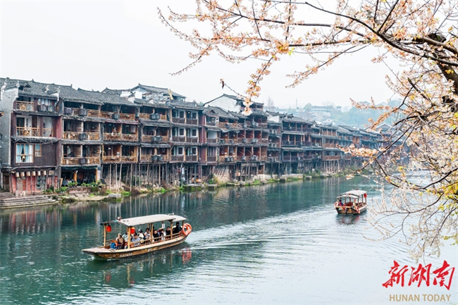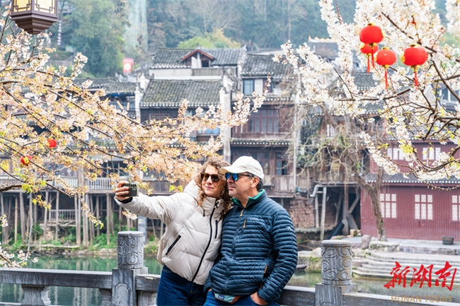 Recently, the cherry blossoms at Fenghuang Ancient Town have entered their full bloom, brimming with spring vitality. Visitors stroll through the blossoms, fully enjoying the spring scenery. (Photo/Liang Yonghong)