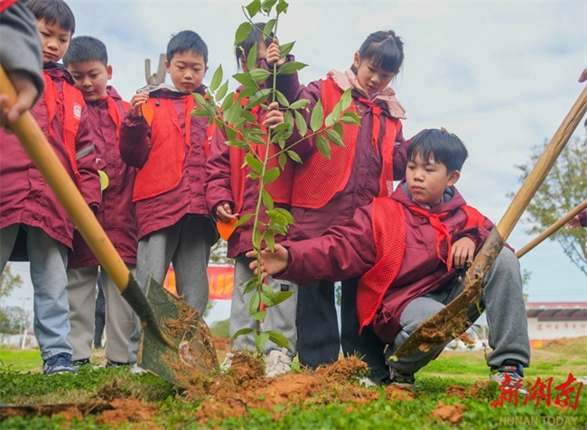 On March 11, students plant trees at the Yutan (Dongyang) School in Daoxian County. March 12 marks China's National Tree Planting Day. Voluntary tree-planting activities are being held across the province, to increase green coverage, boost ecological protection, and jointly build a beautiful homeland. (Photo/Jiang Keqing and Jiang Pingjiao)