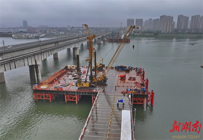 Construction of all 19 drilled piles for the No. 137 main pier of the Changsha Xiangjiang River Grand Rail-road Bridge has been completed by March 17. This rail-road bridge is a critical control project on the Changsha-Ganzhou High-speed Railway Hunan section. (Photo/Tong Di, Hunan Daily)