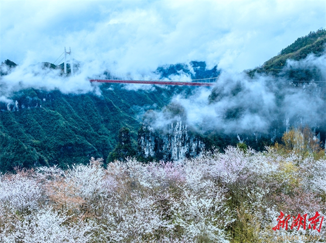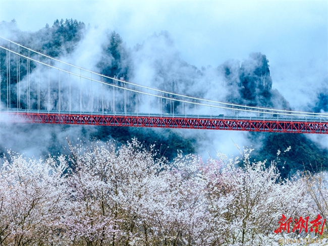 On March 18, the Aizhai Wonder Scenic Area is shrouded in clouds and mist after a rainfall. Cherry blossoms burst into bloom on mountains, complementing with Aizhai Bridge beautifully, transforming the landscape into an exquisite "Chinese ink wash painting." (Photo/Peng Jing)