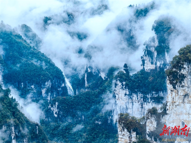 On March 18, the Aizhai Wonder Scenic Area is shrouded in clouds and mist after a rainfall. Waterfalls in the Dehang Canyon cascaded down, harmonizing beautifully with the mist and clouds, resembling an exquisite "Chinese ink wash painting." (Photo/Peng Jing)