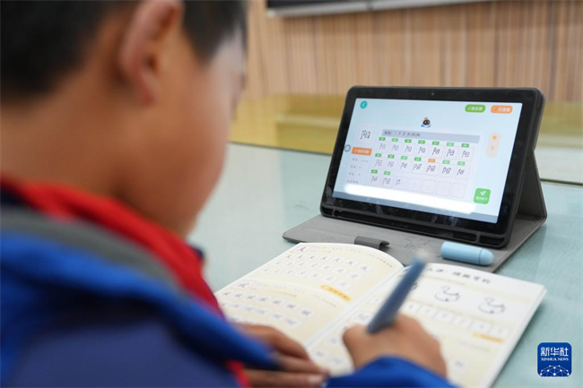 Students took a calligraphy class with AI-powered writing pens at Leifeng Primary School in the Hunan Xiangjiang New Area. Their strokes were synchronized in real time to tablet devices, where the system automatically evaluated their work across 10 criteria such as stroke order, number of strokes, and character structure. The system generated personalized writing reports to help students develop good writing habits. (Photo/Xue Yuge, Xinhua)