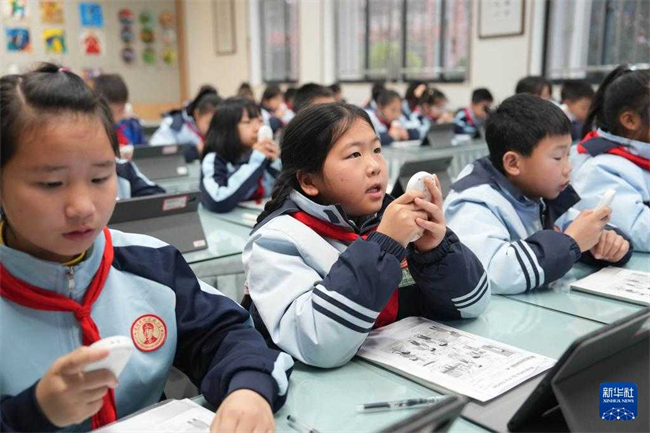 Students answered a teacher's questions through voice-activated response devices during an English class at Leifeng Primary School in the Hunan Xiangjiang New Area. Their responses were transmitted in real time to the teaching terminal, allowing the teacher to accurately assess each student's pronunciation via AI-powered learning analytics. (Photo/Xue Yuge, Xinhua)