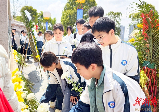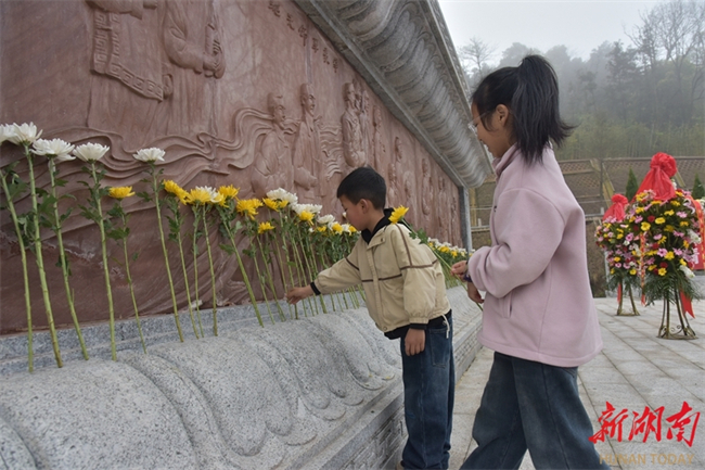 Students of the Dongfanghong Primary School in Longhui County offer flowers to martyrs at the martyrs' cemetery in the county on April 1. As the Tomb-sweeping Day is approaching, people across the province are organizing various forms of memorial activities to commemorate revolutionary martyrs, carrying forward the spirit of heroes and fostering affection for the country. (Photo/Zeng Yong)