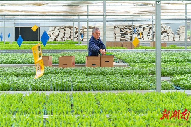 The photo shows a villager packing chili seedlings into boxes at a smart greenhouse in the Yongyi Agricultural Vegetable Plantation in Shixiping Village, Niujiaoba Town, Lengshuitan District, Yongzhou City. In recent years, the local authority has been actively promoting modern agricultural technologies, utilizing advanced cultivation techniques such as smart temperature control equipment and the integration of water and fertilizer. These efforts help farmers cultivate high-quality vegetable seedlings with strong disease resistance and high yields, thereby boosting agricultural efficiency and increasing farmers' income. (Photo/Lei Zhongxiang)