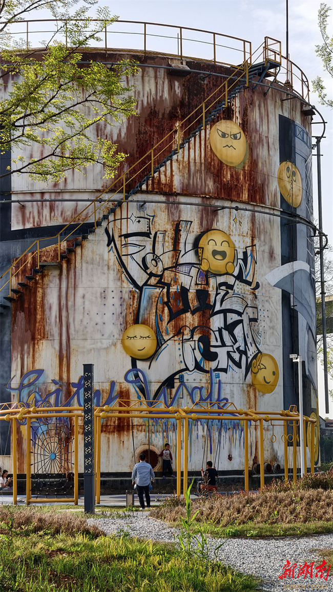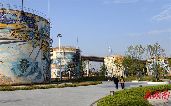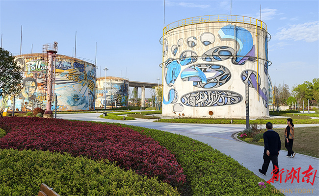 The photo shows residents enjoying leisure time at a square of a lakeside landscape project of Yueyang Jijia Lake Comprehensive Environmental Treatment Project PhaseⅠ. The environmental treatment project innovatively repurposed some facilities from the Qilishan Tank Farm of the SINOPEC Hunan Company, transforming old tanks into a popular photo spot through graffiti art. The site has emerged as a new springtime destination for locals. (Photo/Peng Zhan)