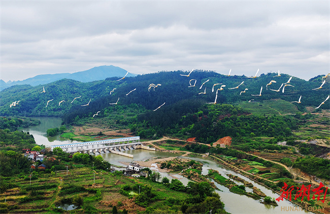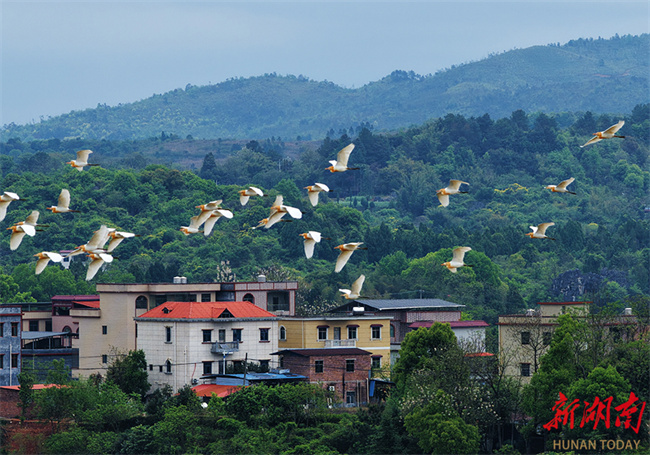The photo, taken on April 7, shows flocks of birds flying along the banks of the Chongling River in Jiahe County. In recent years, the county authority has intensified efforts to improve the environment in both urban and rural areas, achieving continuous improvements in the living environment and natural ecosystems. The initiative has attracted large numbers of wild birds such as egrets to settle and breed in the area. (Photo/Huang Chuntao)
