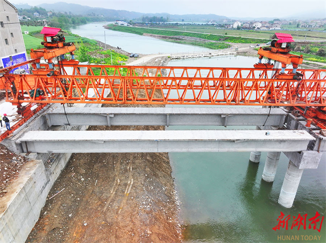 On April 9, the last T-beam was hoisted into place onto the reconstructed Bianshan River Bridge in Lisong Village, Huolianpo Town, Lixian County, marking that the bridge reconstruction project has entered the final sprint phase of deck construction. This bridge, a part of the S233 highway, connects Hunan and Hubei provinces. Originally completed and opened to traffic in 1967, the bridge began to be reconstructed in last October and is scheduled to reopen to traffic within this year. Upon reopening, it is expected to facilitate regional economic and social development at a higher standard. (Photo/Bai Yipu)