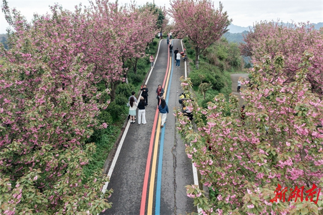 Currently, cherry blossoms are in full bloom at the Niujiao Mountain Tea Garden in Morong Town, Guzhang County. The tea plantation, dressed in vibrant green, attracts many visitors who come to enjoy the spring scenery and savor the cozy spring moments. (Photo/Zhang Shujie)