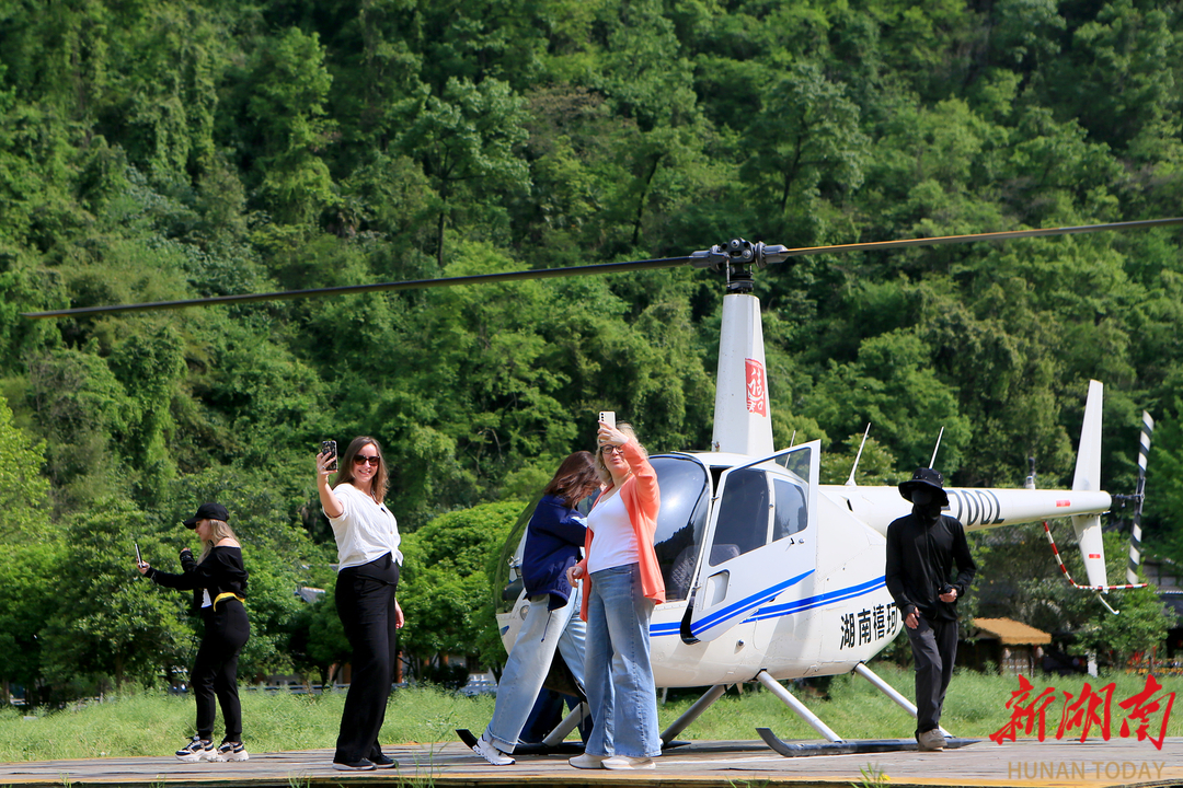 Stepping off the helicopter, the Russian tourists could hardly contain their excitement, repeatedly marveling at the stunning spring scenery of Zhangjiajie. "Lush mountains and lucid waters, along with villages and farmland, are flashing before my eyes—it is like a landscape painting slowly unfolding!" a Russian female tourist shared with Ms. Wang, the tour guide of the group. The Russian tourist added, "The in-depth exploration on the ground and the expansive views from the air gave me a more comprehensive appreciation of Zhangjiajie's scenery and deepened my love for this place."
