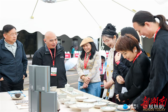 Guests admire Changsha Tongguan Kiln-themed creations produced by Peng Wangqiu, a provincial-level intangible cultural heritage inheritor.