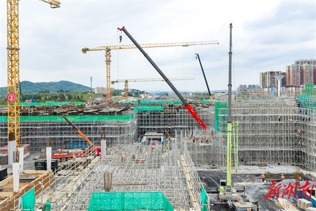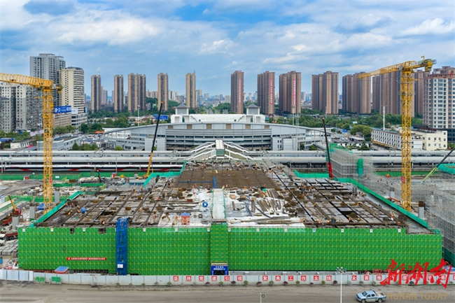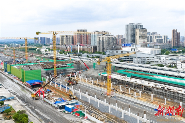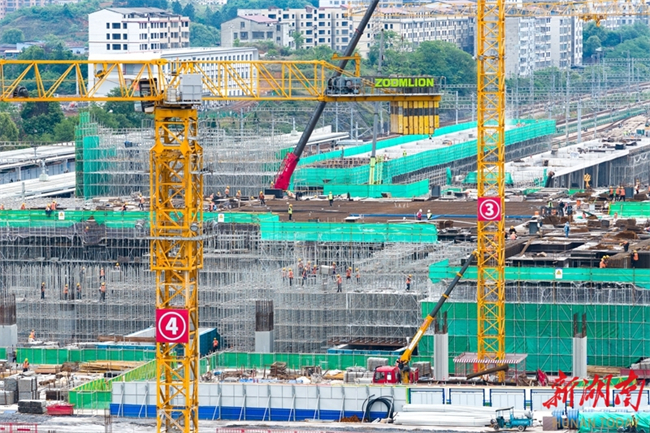 The photo, taken on April 23, shows workers busy constructing the main structure of the railway station waiting hall, a part of the renovation project for the Yongzhou Railway Station on Shaoyang-Yongzhou High-speed Railway. The project, undertaken by the Shanghai-Kunming Passenger Dedicated Line Hunan Company and China Railway Construction Group Co., Ltd., is a critical control project for the Shaoyong High-speed Railway. The station scale will be expanded from three platforms with 13 tracks to six platforms with 18 tracks. Once completed, the Yongzhou Railway Station will become a comprehensive transportation hub connecting Shaoyang-Yongzhou High-speed Railway, Hengyang-Liuzhou Railway, and the planned Guangzhou-Qingyuan-Yongzhou High-speed Railway, facilitating high-speed rail link between southern Hunan and the Guangdong-Hong Kong-Macao Greater Bay Area. (Photo/Lei Zhongxiang and Jiang Lingzhi)
