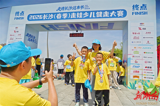 The 2026 Changsha (Spring) Children's Walking Competition, hosted by Hunan Daily, kicked off on the morning of April 26. Under the theme of "Walking into the Book of Changsha," 3,500 families set off from Yazui Park, and walked along the Liuyang River to the Longping Rice Museum. The participants passed by Mawangdui Square, Hanqiao Bridge spanning over the Liuyang River, among other iconic places along the route, experiencing the cultural charm of Changsha City through physical activity. The photo shows children and their parents taking a photo after finishing the competition. (Photo/Xu Xing, Hunan Daily)