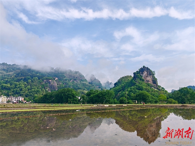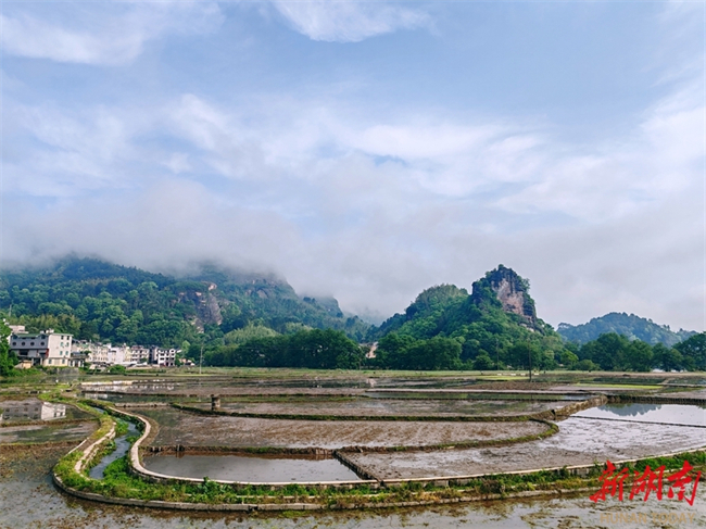 The photo, taken on April 24, shows farmers busy working in paddy fields at the foot of Langshan Mountain in Xinning County. They bend over the paddies against the backdrop of peak clusters shrouded by clouds and mist, forming a vibrant pastoral landscape. (Photo/Yan Yuebin)