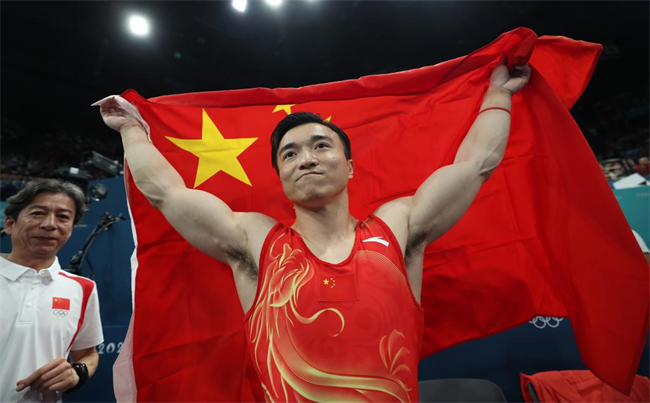 Liu Yang of China celebrates after the men's rings final of artistic gymnastics at the Paris 2024 Olympic Games in Paris, France, Aug. 4, 2024. (Xinhua/Cao Can)