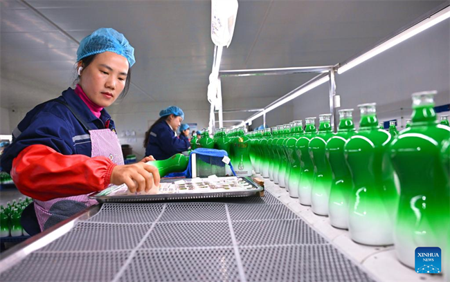 Workers work on the herbicide filling production line of a company in Suiyang District, Shangqiu City, central China's Henan Province, Feb. 24, 2026. Factories and companies across China resumed work after the Spring Festival holiday on Tuesday. (Photo by Li Heng/Xinhua)