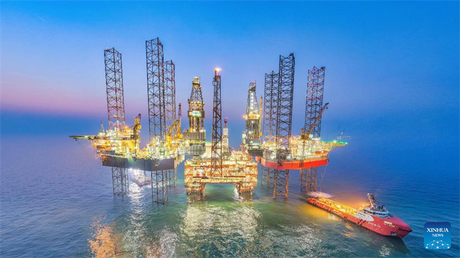 This aerial drone photo taken on Feb. 24, 2026 shows an offshore oil and gas platform in Bohai Oilfield. Factories and companies across China resumed work after the Spring Festival holiday on Tuesday. (Photo by Du Penghui/Xinhua)