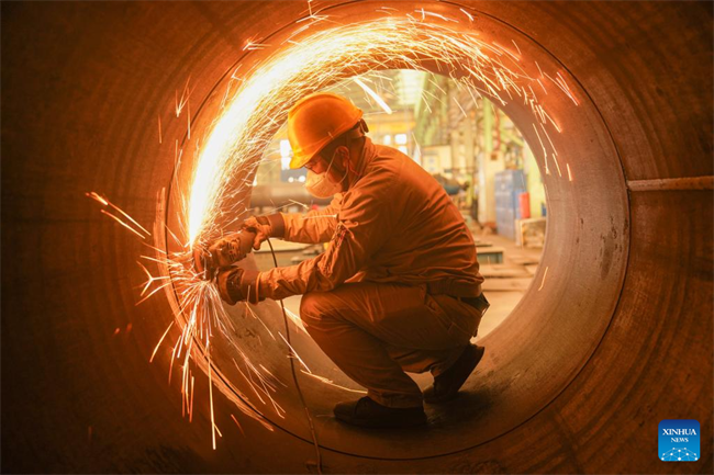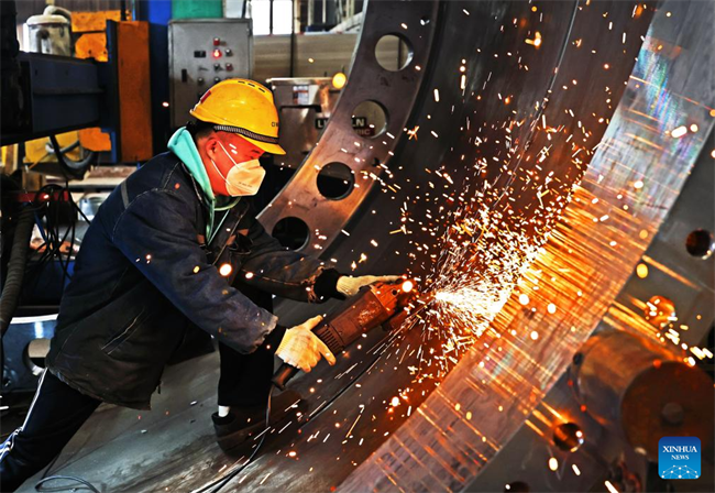 A worker works at the workshop of a wind power equipment company in an economic and technological development zone in Lianyungang, east China's Jiangsu Province, Feb. 24, 2026. Factories and companies across China resumed work after the Spring Festival holiday on Tuesday. (Photo by Wang Jianmin/Xinhua)
