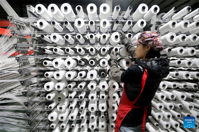 A worker works in a woven bag manufacturing enterprise in Lianyun District, Lianyungang City, east China's Jiangsu Province, Feb. 24, 2026. Factories and companies across China resumed work after the Spring Festival holiday on Tuesday. (Photo by Wang Chun/Xinhua)