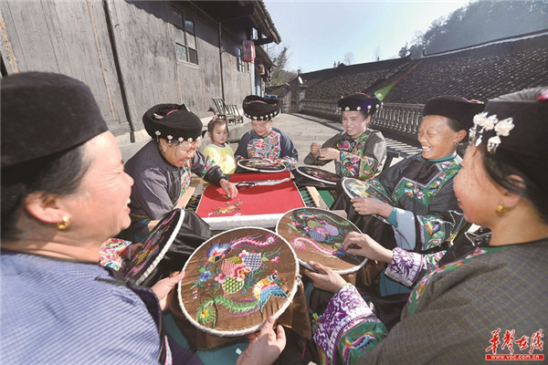 Planting, Miao embroidery, rural tourism, and other featured industries have been boosted based on local conditions, to change the poverty alleviation modal from mainly relying on external support like a blood transfusion to a more sustained effort from self-motivation. A pathway to eliminating poverty and getting prosperous has taken shape, featuring booming industries, favorable infrastructure, high standards, good guarantees, and happy life. The photo shows embroiderers producing Miao embroideries at a farmers' specialized cooperative in Shibadong Village, Paibi Township (today's Shuanglong Town), Huayuan County.