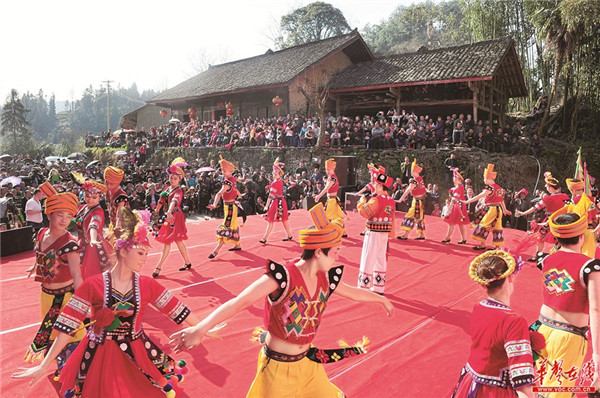 The poverty alleviation goal has been achieved on schedule, with 51 counties, 6,920 villages, and 6.82 million rural residents that fell below the current poverty line have been lifted out of poverty. The food and clothing needs of these people are guaranteed, and their access to compulsory education, essential medical services, safe housing and drinking water is ensured. The photo shows villagers celebrating the Chinese Spring Festival at Chuanyanshan Village, Xupu County.