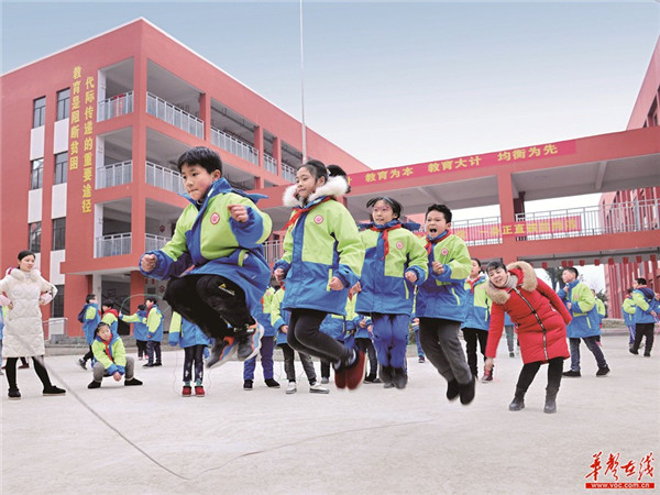 Hunan Province has worked solidly to help the poor by improving education. Fiscal support of 8.995 billion yuan has been invested in constructing the "Lotus Schools" in poor regions. The photo shows students practicing rope skipping at a Lotus School in Dongkou County.