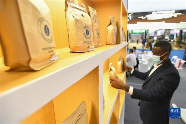 An exhibitor sorts out African coffee products at the second China-Africa Economic and Trade Expo held in Changsha City, Hunan Province. (Photo/Chen Zeguo, Xinhua News Agency)