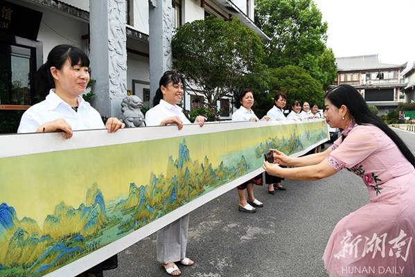 A huge Hunan embroidery work "Thousands of Miles of Rivers and Mountains" was completed at the Changsha Embroidery Research Institute on September 19, 2022. It was made by Jiang Zaihong, Chinese Master of Arts and Crafts and representative inheritor of Hunan embroidery as a national intangible cultural heritage, and her team. The national treasure painting "Thousands of Miles of Rivers and Mountains" was drawn on a hand scroll. This embroidery work is at a full size of the original hand scroll, with a total length of 12 meters. Meticulous Hunan-style embroidery stitch skills were adopted in the embroidery. It will be displayed as a gift for the upcoming 20th CPC National Congress. (Photo/Tian Chao, Hunan Daily)