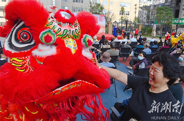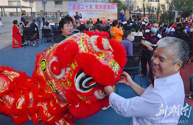 The photos, taken on September 25, show residents touching a traditional lion head for good luck. The Shaping Apartment for the Aged in Kaifu District of Changsha organized a large-scale art performance that day, to greet the upcoming 20th CPC National Congress and Double Ninth Festival, also known as Chongyang Festival, which falls on the 9th day of the 9th month. Various forms of art performances were staged to carry forward the traditional virtue of respecting the elderly. (Photos/Xu Xing, Hunan Daily)