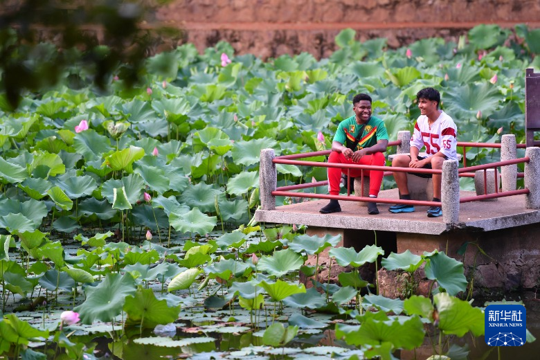 He Ding (L) enjoys a leisure time with his friend at a lotus pond in CSU after a football match on June 14. (Photo/Chen Zeguo)