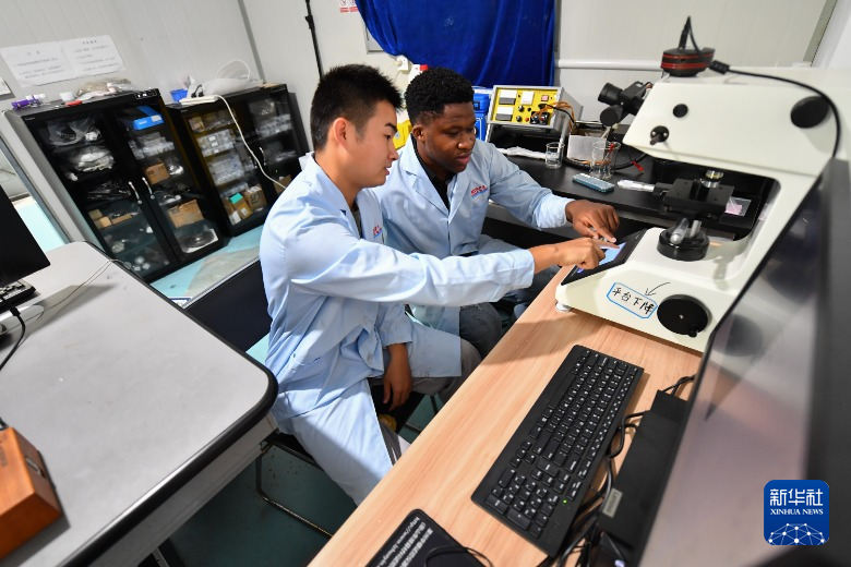 The photo, taken on June 26, shows He Ding (R) listening to Liu Yashuai, an upperclassman, to explain the operation of a coordinate measuring machine at the Complex Surface Element Manufacturing Lab of CSU. (Photo/Chen Zeguo)
