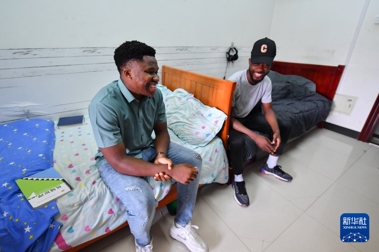 He Ding chats with his roommate at the international student dormitory in CSU on June 14. (Photo/Chen Zeguo)