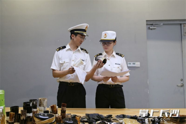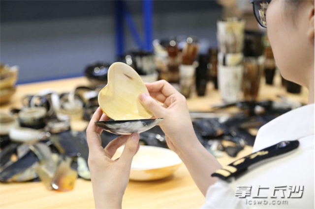 The Xingsha Customs, a branch of the Changsha Customs, dispatched personnel to the site to verify the declaration information of the overseas exhibition materials, including seven categories of objects, such as moisturizing cream from Kenya, baobab fruit powder and marula seed oil from Namibia, and cow-horn craft products from Uganda