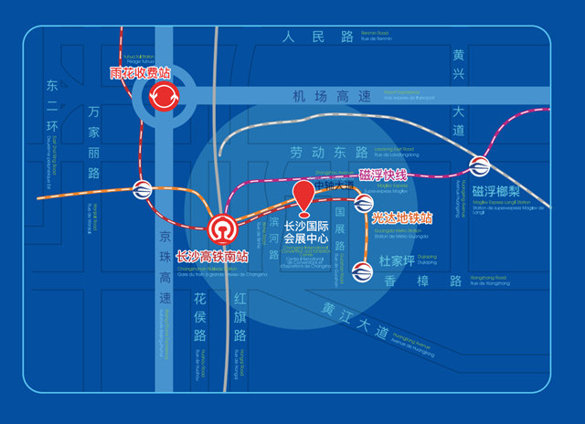 Metro Line: Take Line 2 or Line 4 and get off at Exit 4 of the Guangda Station, and walk 400 meters to the Changsha International Convention and Exhibition Center.